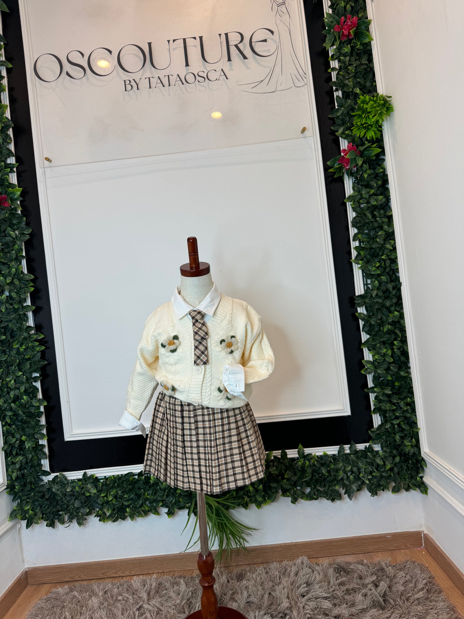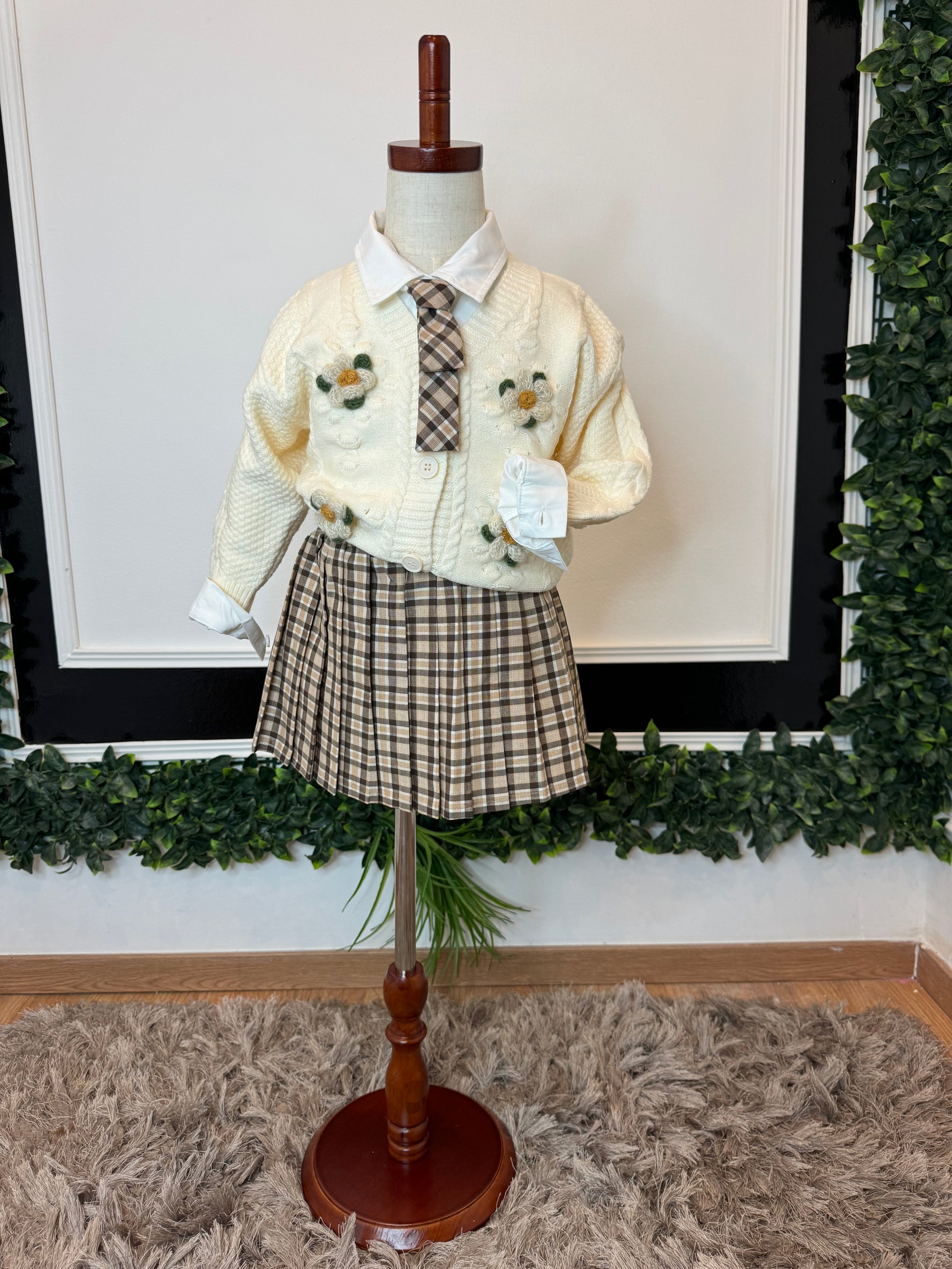 une chemise blanche en coton, un pull tricoté et une jupe plissée.