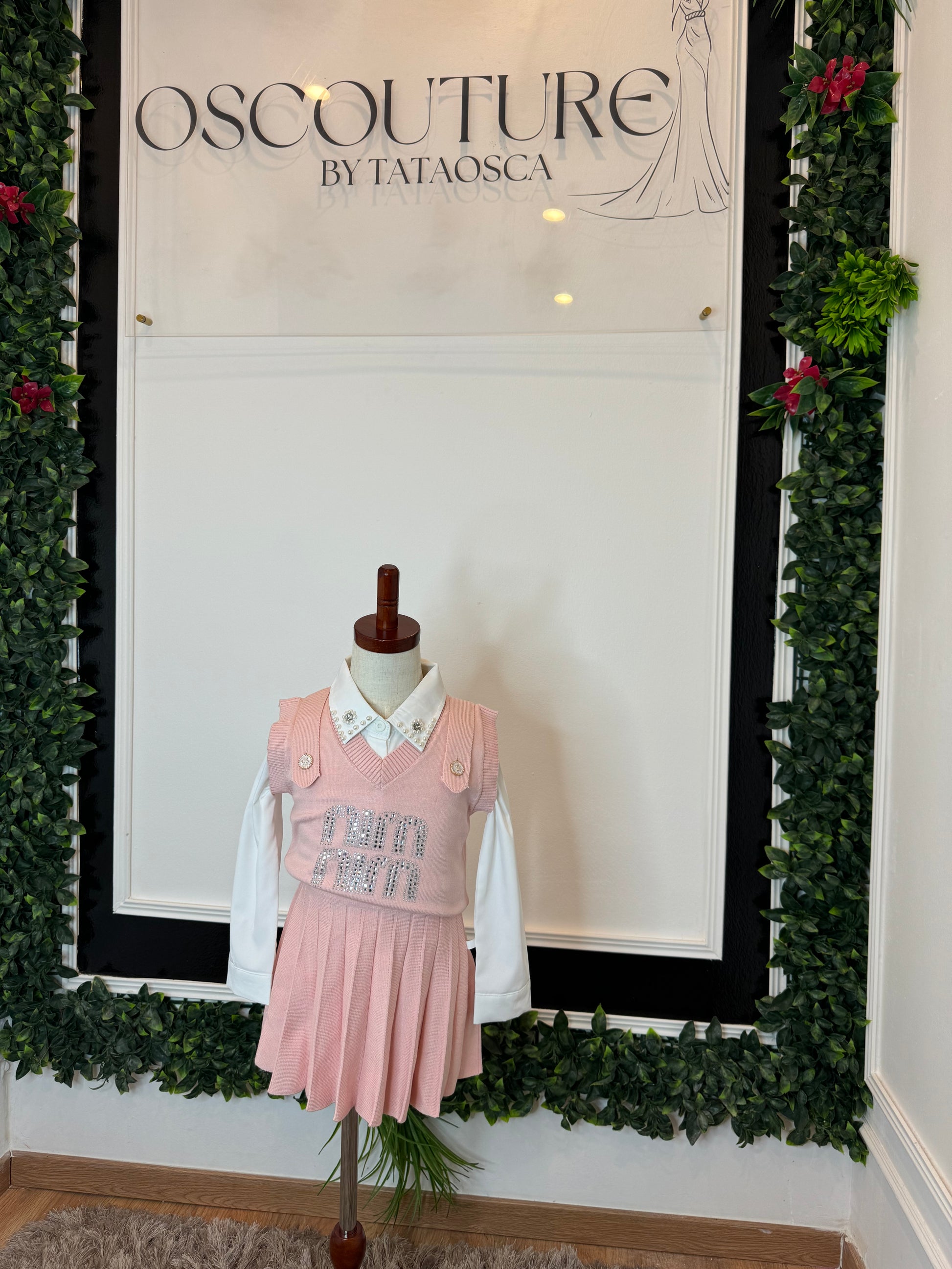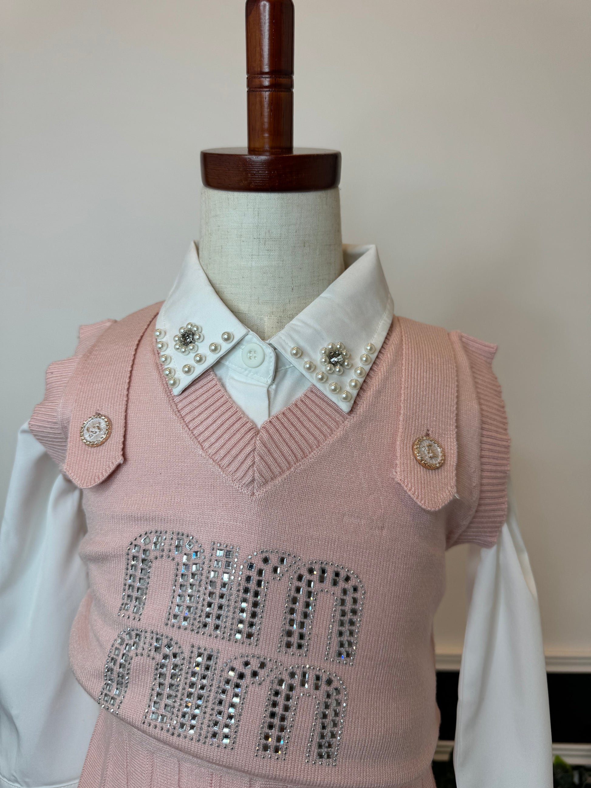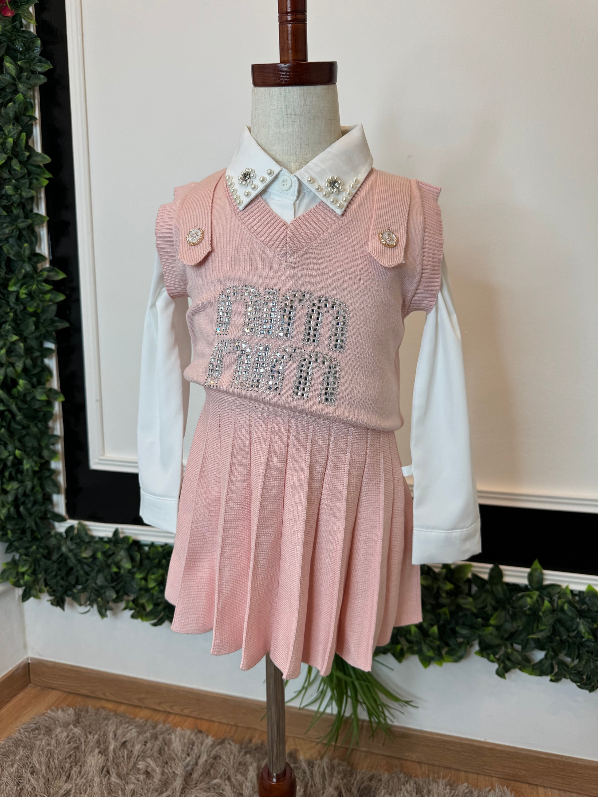 une chemise blanche en coton avec des détails sur le col, un pull tricoté et une jupe plissée.